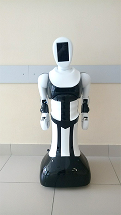 Учебно-лабораторный комплект для изучения автономных антропоморфных сервисных роботов представляет собой блочно-модульную модель робота, включающую: мобильное шасси, антропоморфный торс, две подвижных руки-манипулятора, подвижное основание головы. В состав комплекта входит: система автономной навигации робота внутри помещений, система дистанционного управления в режиме телеприсутствия, система управления манипуляционными роботами, система распознавания изображений, человеко-машинный интерфейс управления.